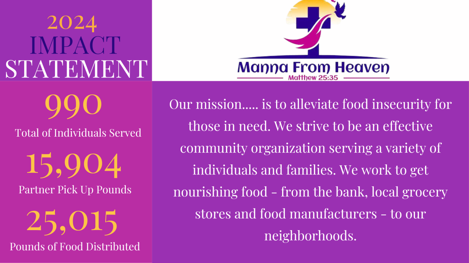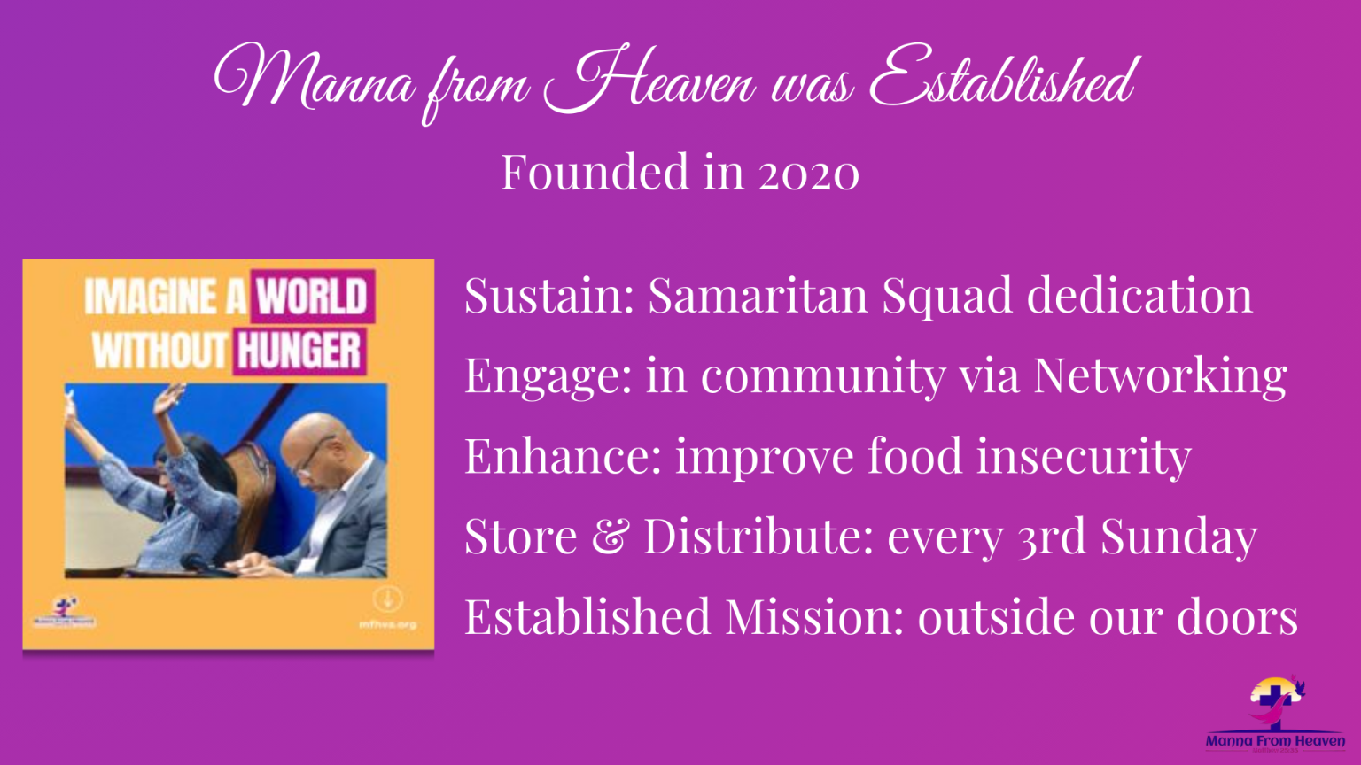 Manna from Heaven was founded in 2020 at the height of the COVID-19 pandemic under the leadership of Bishop Leslie Patterson and Co-Pastor Dr. Francene V. Patterson. Our mission is to feed those who are less unfortunate then we are.