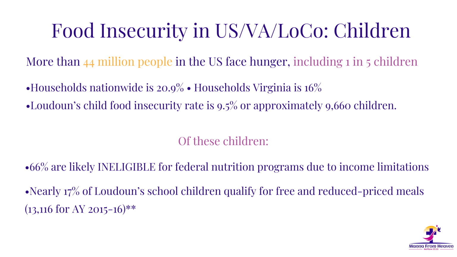 In the beginning MFH was led to serve families in the immediate vicinity of Sterling; however, the team quickly realized that food insecurity extended throughout Northern Virginia and surrounding localities – way beyond its doorsteps. We have a program that operates from the generosity of volunteers.
